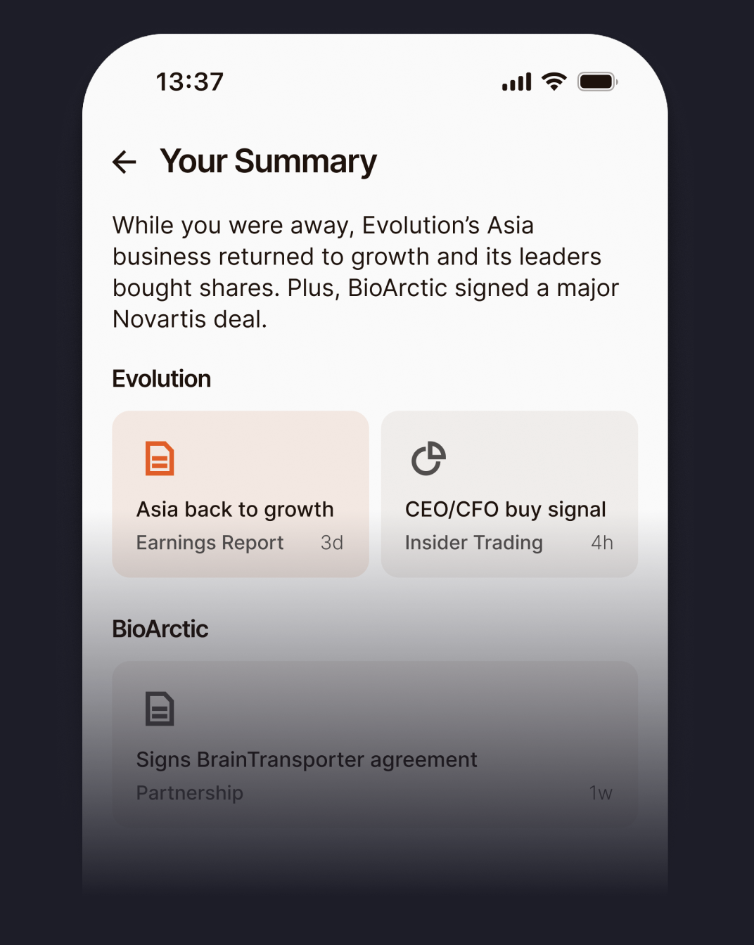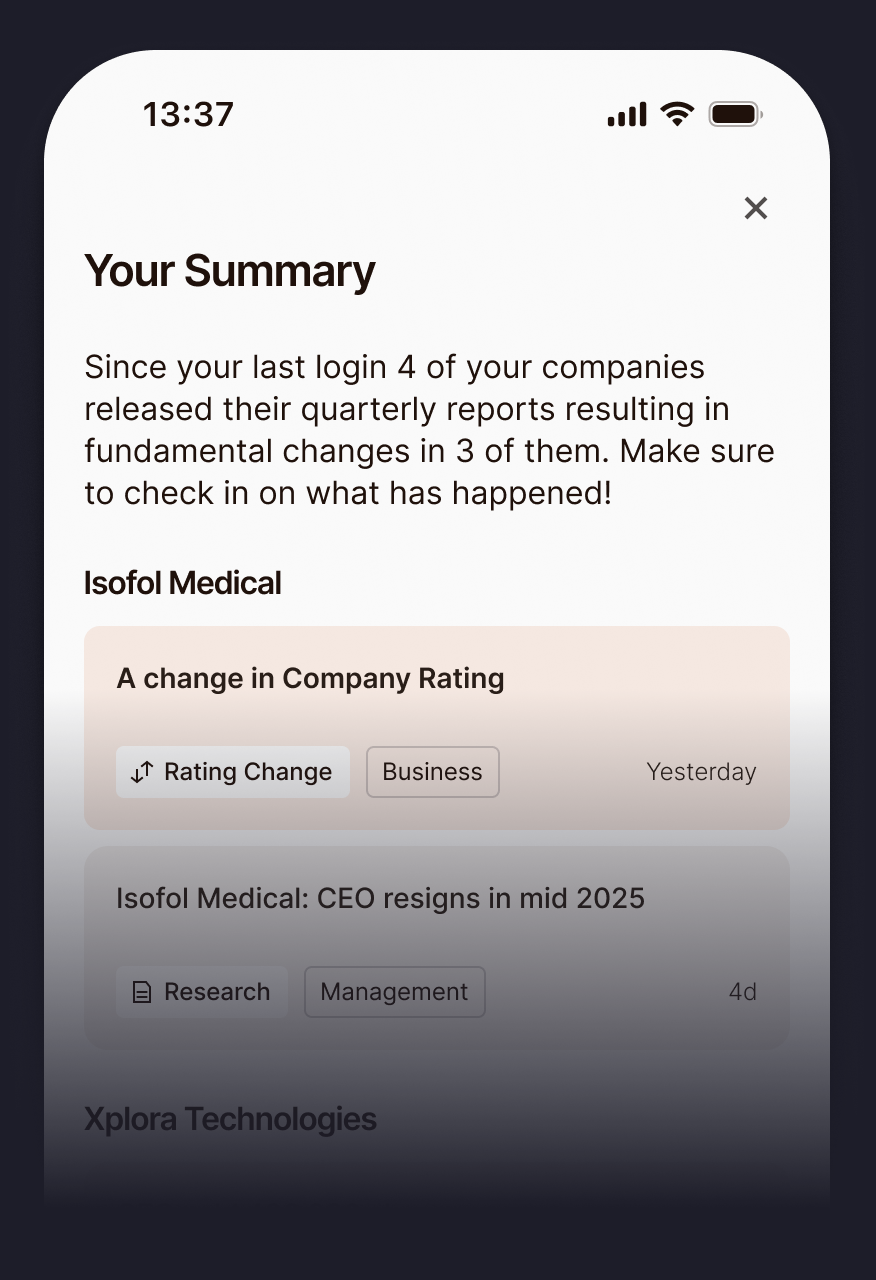 Get notified only when it counts, like fundamental changes to a company's outlook - no noise.